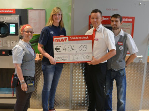 Seit der Eröffnung des REWE-Marktes in Rehburg Anfang September 2014 wurde der DLRG Rehburg-Loccum die Möglichkeit gewährt, in den Genuss der durch Kunden gespendeten Pfandbons zu kommen. Mit einem Schild an der Rückgabestation für Pfandflaschen machen die Rehburg-Loccumer Wasserretter seither auf sich und Ihre 100% ehrenamtlich geleistete Vereinsarbeit aufmerksam. Viele Kunden haben seither die Möglichkeit im Rehburger REWE-Markt genutzt und Ihr Pfandgeld komplett oder zumindest teilweise zugunsten der DLRG Rehburg-Loccum gespendet. REWE-Marktmanager Rudolf Fahn (im Bild 2. v. re.) freute sich zusammen mit seiner Assistentin Alexandra Böse (links) und der dritten Führungskraft im Markt Eugen Fahn (rechts) sehr darüber, den stattlichen Betrag von insgesamt 404,69 EUR stellvertretend für die Rehburg-Loccumer DLRG-Jugend an die Jugendleiterin Lea Blöthe überreichen zu können.